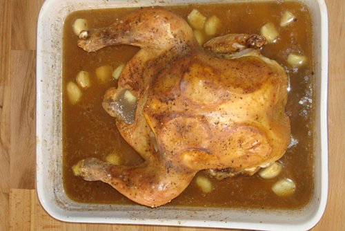 Losaðu hvítlaukana sem eftir eru sundur í geira og flysjaðu þá. Dreifðu þeim í kringum kjúklinginn og helltu vatninu í fatið. Steiktu áfram í 45-60 mínútur, eða þar til kjúklingurinn er steiktur í gegn og tær safi rennur út ef stungið er í lærið þar sem það er þykkast.