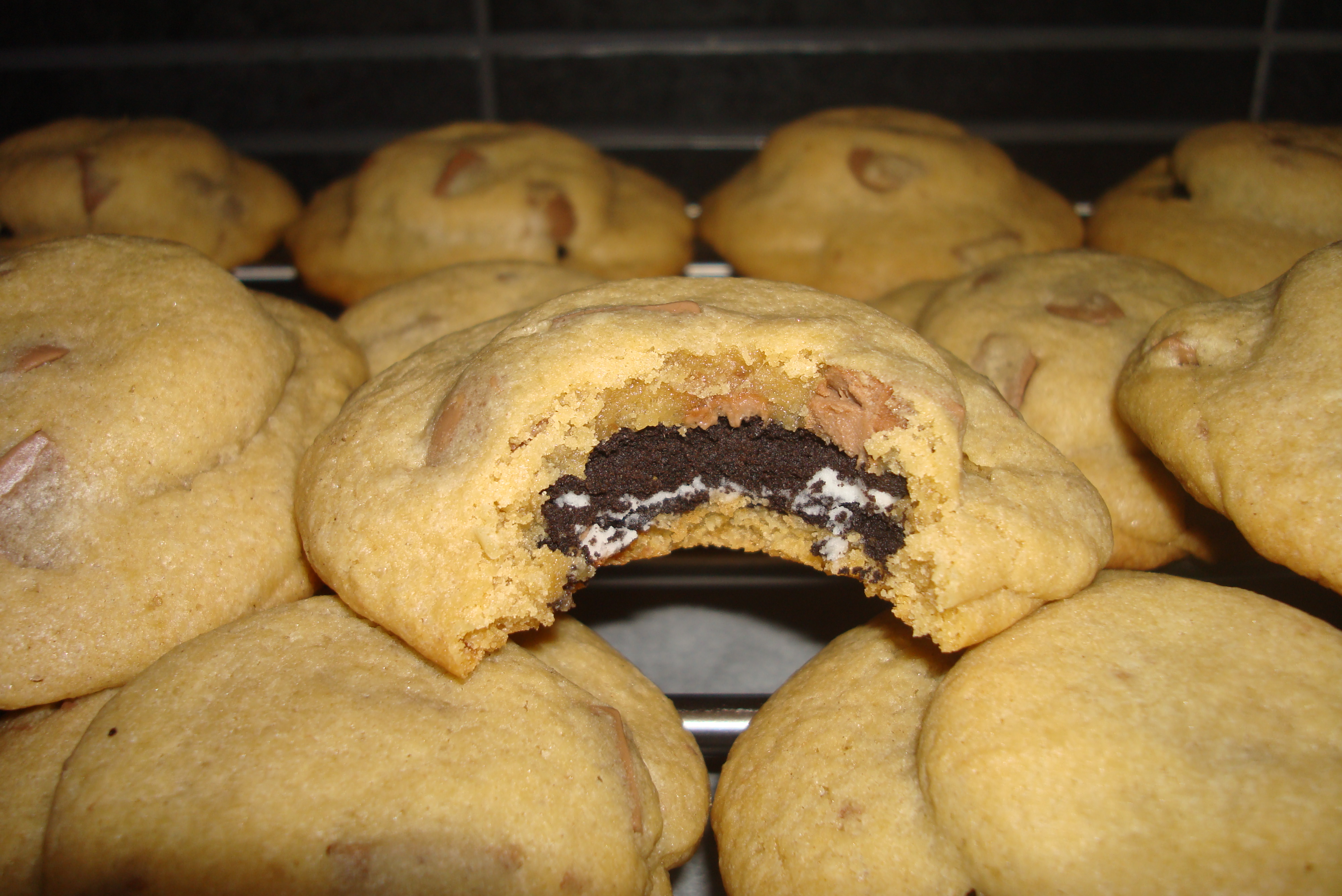 Búðu svo til litlar (ekki pínu) kúlur og settu undir og ofan á oreo kökuna, og klesstu þessu svo saman þar til að hún hverfur alveg inní deigið, þrýsta saman köntunum.